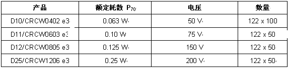 本次發(fā)布的4款設(shè)計套件采用E96系列阻值標準,范圍從10Ω到1MΩ(每檔間隔4個阻值),同時額外包含一個0Ω跳線,每款套件總共包含122種不同的阻值。電阻的容差為±1%,TCR為±100ppm/K,功率耗散為0.063W~0.25W,電阻芯電壓為50V~200V。