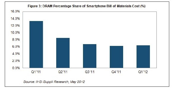 據(jù)IHS iSuppli公司的DRAM動(dòng)態(tài)簡(jiǎn)報(bào),雖然智能手機(jī)的材料清單(BOM)成本穩(wěn)步上升,但一年來(lái)DRAM在其中所占的份額卻下降了一半以上,主要是因?yàn)镈RAM價(jià)格下跌。