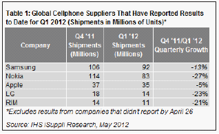 據(jù)IHS iSuppli公司的DRAM市場簡報,爾必達(dá)第一季度營業(yè)收入比2011年第四季度增長1%,占據(jù)大約12.6%的市場份額,排名升至第三。雖然其增長幅度可能顯得很小,但爾必達(dá)的表現(xiàn)優(yōu)于整體DRAM市場。第一季度整體DRAM市場的營業(yè)收入為62億美元,比2011年第四季度的65億美元下降4%,如表1所示。爾必達(dá)的表現(xiàn)也優(yōu)于緊隨其后的美光。美光的第一季度營業(yè)收入環(huán)比下降3%,排名下降一位至第四。