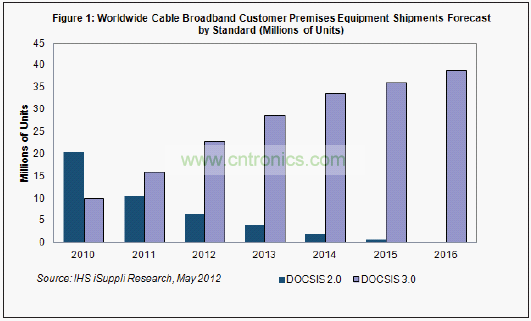 據(jù)IHS iSuppli公司的寬帶與數(shù)字家庭市場(chǎng)追蹤報(bào)告,2011年寬帶電纜運(yùn)營(yíng)商增加布署DOCSIS 3.0,使得該標(biāo)準(zhǔn)首次成為多數(shù)新寬帶有線設(shè)備的主要標(biāo)準(zhǔn)。