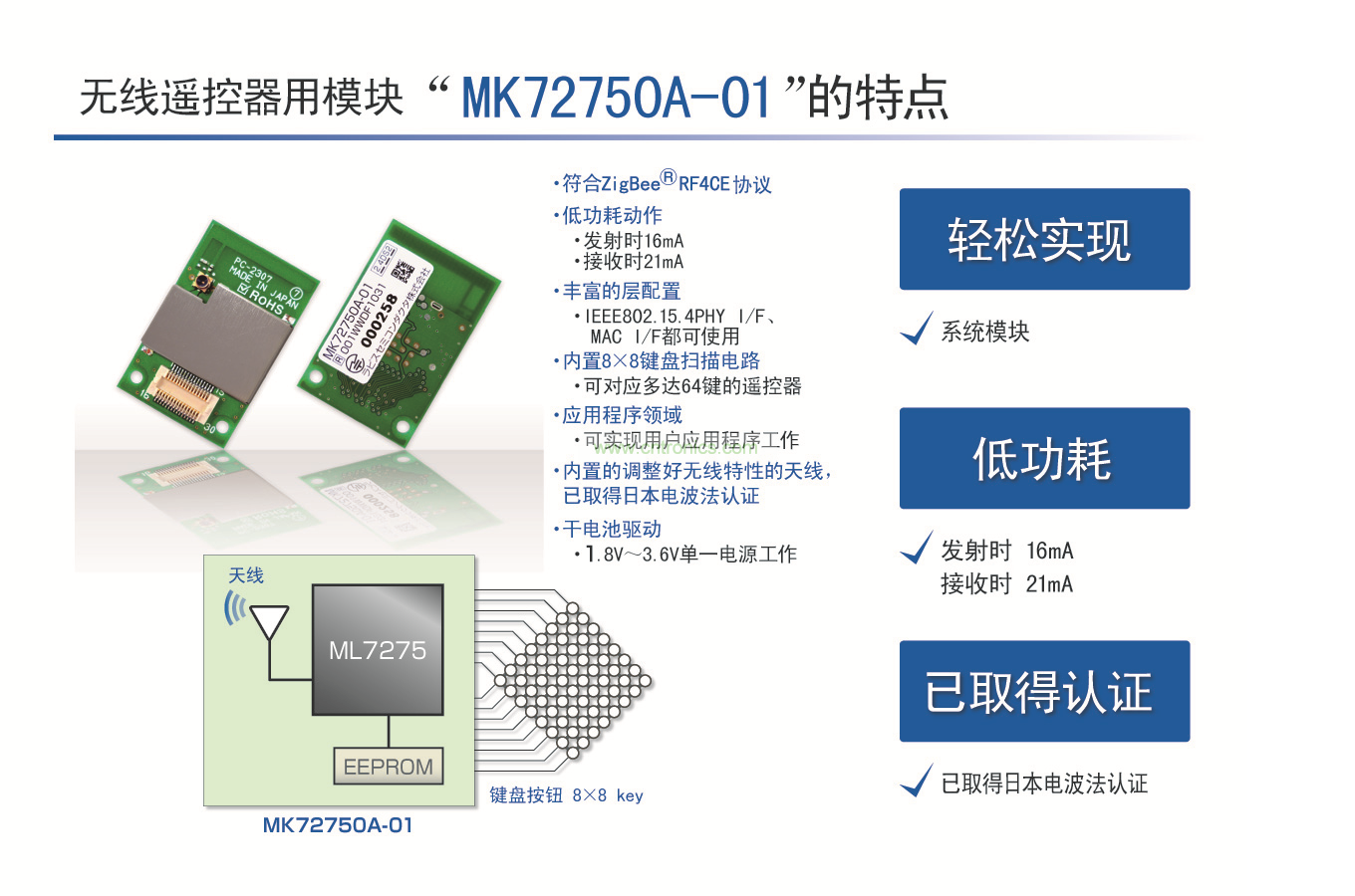 針對(duì)這種情況,LAPIS Semiconductor開(kāi)發(fā)出2.4GHz無(wú)線(xiàn)通信模塊“MK72750A-01”,此模塊符合“ZigBee®RF4CE”協(xié)議,并且可通過(guò)內(nèi)置的調(diào)整好無(wú)線(xiàn)特性的天線(xiàn)立即發(fā)射電波。另外,此模塊作為無(wú)線(xiàn)通信LSI,由于內(nèi)置了本公司生產(chǎn)的“ML7275”,因此僅此模塊可以實(shí)現(xiàn)ML7275著稱(chēng)的低功耗且符合RF4CE規(guī)范的無(wú)線(xiàn)遙控器功能。本產(chǎn)品內(nèi)置調(diào)整好無(wú)線(xiàn)特性的天線(xiàn),已取得日本國(guó)內(nèi)電波法認(rèn)證,所以,無(wú)線(xiàn)技術(shù)開(kāi)發(fā)經(jīng)驗(yàn)較少的客戶(hù)也可開(kāi)始輕松開(kāi)發(fā)。在日本國(guó)內(nèi),可以立即發(fā)射電波進(jìn)行評(píng)價(jià)、開(kāi)發(fā),因而開(kāi)發(fā)周期亦可大大縮短。另外,使用了本公司設(shè)計(jì)的無(wú)線(xiàn)通信LSI,LSI相關(guān)事項(xiàng)可提供迅速、精準(zhǔn)的技術(shù)支持。