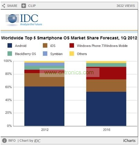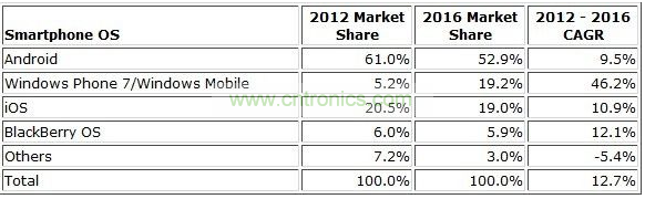 下表反映了IDC對2012年和2016年全球智能手機操作系統(tǒng)所占市場份額以及2012到2016年之間復(fù)合年增長率的預(yù)期: