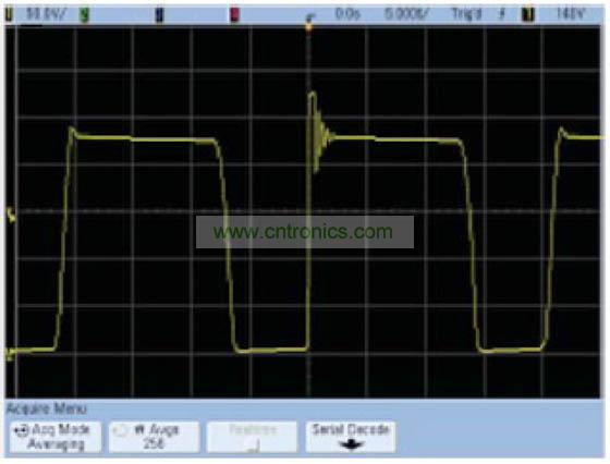 這種算法在垂直分辨率為12位時效果最好,因為再繼續(xù)增加下去,其他因數(shù)(例如示波器的垂直增益或偏置精度)將起到?jīng)Q定性作用。平均模式的優(yōu)點是,它對示波器的實時帶寬沒有任何限制。缺點是它要求使用重復(fù)性信號,并會降低波形更新速率。在正常采集模式下與平均模式下捕獲的開關(guān)電源的Vds分別如圖1和圖2所示。