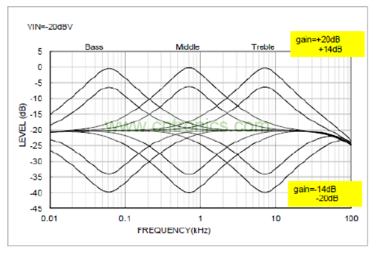 為了實現(xiàn)音效處理,有必要了解一下音頻DSP均衡器(EQ) 的作用。均衡器具有增益及濾波的電路,增益電路對聲音進行提升(Boost) 與削弱(Cut) ;濾波電路可以調(diào)節(jié)到需要的頻率響應(yīng)。普通模擬音效處理IC一般可以提供2頻帶(Bass/Treble) 或者3頻帶(Bass/Middle/Treble),而數(shù)字音效處理IC可以提供多個頻帶,比如7頻帶,甚至更多。圖5是3頻帶EQ的曲線。