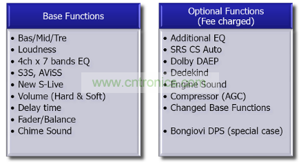 左邊表中是一些基本功能,其中S3S、AViSS、New S-Live是安森美半導(dǎo)體自己的算法,可免費提供給客戶;右邊是可供選擇的算法,需要使用授權(quán),或更改時需要研發(fā)費用,其中包括業(yè)界知名的SRS CS Auto及Dolby DAEP算法,而Bongiovi DPS是最先進的音效處理技術(shù)。安森美半導(dǎo)體目前是該技術(shù)唯一的IC合作伙伴。
