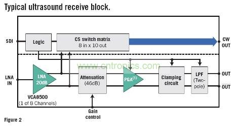 首先以超聲波設(shè)備為例來(lái)探討模擬性能需求。通過(guò)該范例,本文將介紹如何在性能、功耗、尺寸以及集成度之間進(jìn)行權(quán)衡,并檢測(cè)雙極性與CMOS工藝技術(shù)的適用性。圖1是典型超聲波機(jī)器的系統(tǒng)方框圖,展示了傳輸與接收兩個(gè)部分。這兩個(gè)部分負(fù)責(zé)驅(qū)動(dòng)傳感器與數(shù)字處理部分(未顯示),從而構(gòu)成完整的超聲波設(shè)備。