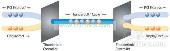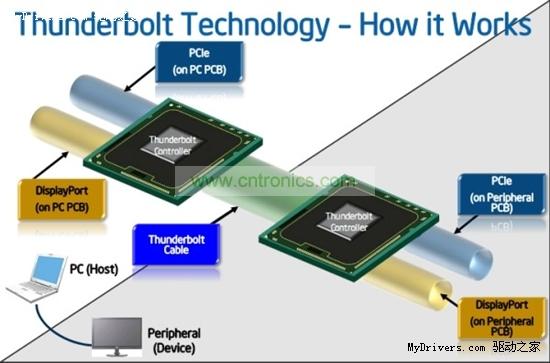Thunderbolt接口由一顆Intel控制芯片驅(qū)動,通過PCI-E x4、DisplayPort總線與系統(tǒng)芯片組相連,也可以直接連接Intel處理器內(nèi)集成的圖形核心進(jìn)行DisplayPort輸出。