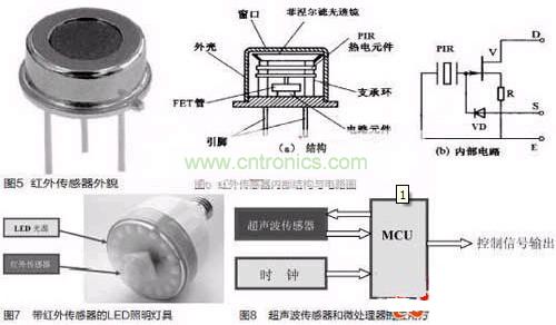 被動(dòng)式紅外傳感器有三個(gè)關(guān)鍵性的元件:菲涅爾濾光透鏡,熱釋電紅外傳感器和匹配低噪放大器。菲涅爾透鏡有兩個(gè)作用:一是聚焦作用,即將熱釋紅外信號(hào)折射在PIR上:二是將探測(cè)區(qū)內(nèi)分為若干個(gè)明區(qū)和暗區(qū),使進(jìn)入探測(cè)區(qū)的移動(dòng)物體/人能以溫度變化的形式在PIR上產(chǎn)生變化的熱釋紅外信號(hào)。一般還會(huì)匹配低噪放大器,當(dāng)探測(cè)器上的環(huán)境溫度上升,尤其是接近人體正常體溫(37℃)時(shí),傳感器的靈敏度下降,經(jīng)由它對(duì)增益進(jìn)行補(bǔ)償,增加其靈敏度。輸出信號(hào)可用來(lái)驅(qū)動(dòng)電子開關(guān),實(shí)現(xiàn)LED照明電路的開關(guān)控制。圖5是紅外傳感器外貌,圖6是紅外傳感器內(nèi)部結(jié)構(gòu)與內(nèi)部電路圖。圖7是帶紅外傳感器的LED照明燈具,這是一款E27標(biāo)準(zhǔn)螺口燈頭的燈具,其電源適用范圍是AC180V-250V(50/60Hz),紅外傳感器檢測(cè)范圍大約在3m~15m,其標(biāo)準(zhǔn)產(chǎn)品IFS-Bulb3W燈具達(dá)80lm,5W燈具達(dá)140lm.在LED光源模塊的中央部分嵌入紅外線傳感器。一旦紅外傳感器檢測(cè)到人的體溫,LED電燈泡將會(huì)在50s內(nèi)自動(dòng)開啟與關(guān)閉。適用于任何一種室內(nèi)應(yīng)用,如走廊、儲(chǔ)藏室、樓梯和大廳入口處。