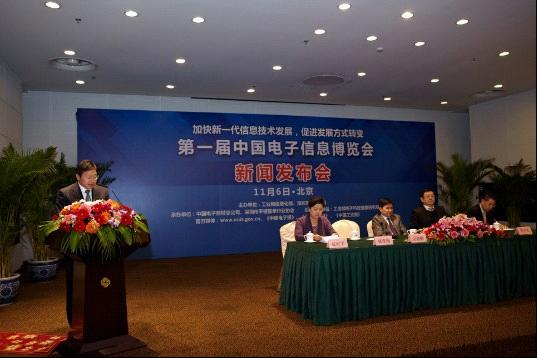 2012年11月6日下午,工業(yè)和信息化部與深圳市人民政府在北京召開新聞發(fā)布會,宣布2013年4月10日至12日在深圳市共同舉辦第一屆中國電子信息博覽會。工業(yè)和信息化部電子信息司副司長、中國電子信息博覽會組委會辦公室副主任安筱鵬出席會議并介紹了籌備舉辦第一屆中國電子信息博覽會的總體情況;深圳市經(jīng)濟(jì)貿(mào)易和信息化委員會副主任、中國電子信息博覽會組委會辦公室副主任賈興東介紹了展館的總體安排;中國電子器材總公司副總經(jīng)理、中國電子信息博覽會組委會辦公室副主任兼秘書長陳雯海,深圳市平板行業(yè)協(xié)會常務(wù)副會長、中國電子信息博覽會組委會辦公室副主任兼副秘書長許生介紹招展的進(jìn)展情況。會議由工業(yè)和信息化部辦公廳新聞處處長張紅宇主持。新華社、中央人民廣播電臺、中央電視臺、中國電子報、人民郵電報、中國工業(yè)報等中央媒體和業(yè)內(nèi)媒體,以及業(yè)內(nèi)相關(guān)行業(yè)協(xié)會和重點企業(yè)參加了新聞發(fā)布會。