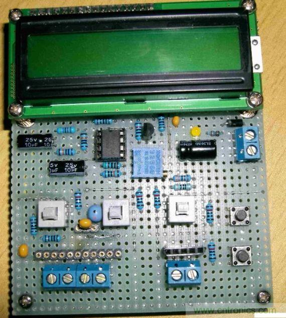 上圖中,Btn1是單片機(jī)復(fù)位按鈕;Btn2是校準(zhǔn)按鈕,在測量小電容時候可以隨時按下清零顯示;Btn3是功能切換按鈕,用來在測量LCF(頻率、小電容、電感)和測量電解電容之間切換。