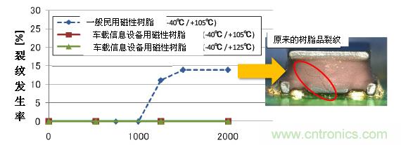 熱沖擊投入周期數(shù)和裂紋發(fā)生率的關(guān)系如圖3所示。一般民用市場(chǎng)的磁性樹脂在1000輪以下就會(huì)產(chǎn)生裂紋,而我們開發(fā)的車載信息設(shè)備用磁性樹脂在2000輪之后仍然沒(méi)有產(chǎn)生裂紋。并且確保即使在更嚴(yán)厲的-40℃⇔+125℃環(huán)境下的熱沖擊試驗(yàn)中也不會(huì)產(chǎn)生裂紋。