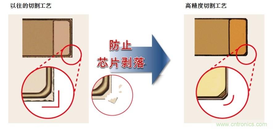 ROHM通過采用與以往不同的、獨創(chuàng)的微細化技術(shù),在開發(fā)制造系統(tǒng)的同時,改進切割方法,在切割工藝上將封裝尺寸公差大幅降至±10μm。通過提高尺寸精度,消除毛刺和碎片,有助于減少貼裝時的吸著誤差以及提高貼裝精度。