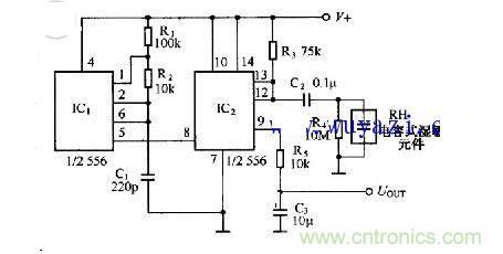 高分子電容型濕敏元件的應用電路如圖所示。它由兩個時基電路IC1、IC2組成。IC1及外圍元件組成多諧振蕩器,主要產(chǎn)生觸發(fā)IC2的脈沖。ICz和電容型濕敏元件及外圍元件組成可調(diào)寬的脈沖發(fā)生器,其脈沖寬度將取決于濕敏元件的電容值的大小。調(diào)寬脈沖從IC2的9腳輸出,經(jīng)R5、C3濾波后成為直流信號輸出。它正比于空氣的相對濕度,其靈敏度為2mv/%RH。