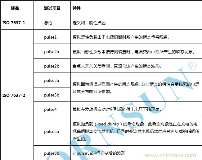 針對汽車電子自身產(chǎn)生的干擾,國際無線電干擾委員會(huì)(CISPR)對汽車電子業(yè)提出了嚴(yán)格的要求,尤其是車載收音機(jī)、數(shù)字電視、導(dǎo)航設(shè)備都是這種干擾的重災(zāi)區(qū)。所以 CISPR25:用于保護(hù)車載接收機(jī)的無線電騷擾特性的限值和測試方法,對汽車電子自身的發(fā)射狀態(tài)也有了明確的等級(jí)判定。EMS方面的測試項(xiàng)目如下所示: