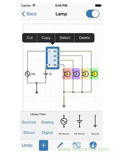 《電子電路仿真和設(shè)計 iCircuit》是首屈一指的電路設(shè)計和試驗應用程序,功能非常強大,這是學生,業(yè)余愛好者和工程師的完美伴侶。其先進的模擬引擎可以處理模擬和數(shù)字電 路和實時分析的功能 。只要您會任何CAD程序,您就可以使用它:添加元素,它們連接在一起,并設(shè)置其屬性,但iCircuit不像其他CAD程序,因為它始終是模擬。這就像 與實際電路的工作 。你不停止進行測量,或花很多時間配置。雖然這個只是玩玩,但他像真實的電路一樣!有超過30種元件,你可以用它來構(gòu)建電路。從簡單的電阻,開關(guān),晶體 管,數(shù)字門。您還可以模擬探頭檢測周圍的電路,有即時讀取電壓和電流的萬用表。如果你想看經(jīng)過一段時間數(shù)值是如何變化的,那么你可以使用內(nèi)置示波器。