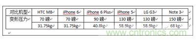 此外,美國《消費者報告》利用三點式測試方案,將iPhone 5、iPhone 6、iPhone 6 Plus、HTC M8、LG G3以及三星Note 3手機懸空固定,并對機身中間部位施加壓力,計算上述手機變彎時所能承受的壓力上限。結(jié)果顯示(見表),iPhone 6/Plus和HTC M8的承受壓力最低(圖4),在受力達(dá)31kg左右時就會被壓彎,而表現(xiàn)最好的是Note 3,在68kg壓力時“防線”才會崩潰。