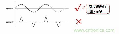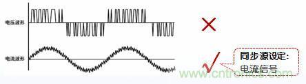 當(dāng)被測對象是變頻器,其電流波形的畸變相比電壓波形較小時(shí),請選擇電流信號作為同步源。