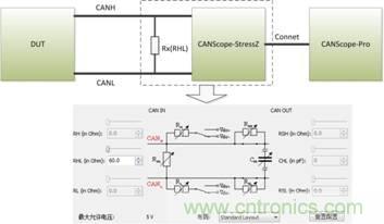 由此可見,該方法雖然可以大致測量出CAN節(jié)點(diǎn)的差分電平位信號特征,但由于其用于做分析的樣本很少,測量方式有很難操作,所以為了提高測量結(jié)果的準(zhǔn)確度,減低人工成本,文章中對測試方法進(jìn)行了改進(jìn),使用CANScope-Pro總線分析儀、CANScope-StressZ擴(kuò)展板,使用配套軟件的樣眼圖與對稱性測試進(jìn)行測量。