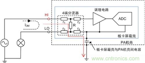 3.電流通道接入高端和低端,測(cè)量結(jié)果也不同,內(nèi)部板卡屏蔽殼與機(jī)殼間多少都會(huì)存在一些雜散電容(空間中兩個(gè)絕緣導(dǎo)體中存在電容),若電流通道接入高端,產(chǎn)生泄漏電流(圖3中紅色標(biāo)記線),因此電流測(cè)量輸入應(yīng)當(dāng)串在共模電壓較低的地方(低端)。