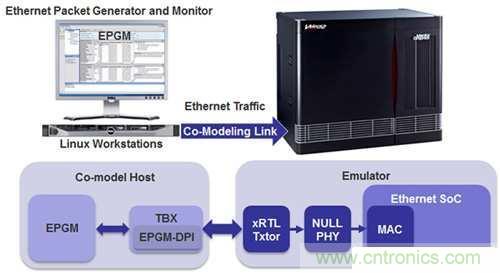 將這種設(shè)置與采用虛擬方法的設(shè)置進(jìn)行比較,如明導(dǎo)國際(Mentor Graphics)的虛擬乙太網(wǎng)設(shè)備(VirtuaLAB)。在此場景中,裝有Linux環(huán)境的工作站連接硬體加速器,在工作站上用軟體對乙太網(wǎng)測試儀實(shí)現(xiàn)一樣的行為模式。基于成熟的實(shí)現(xiàn)智慧財(cái)產(chǎn)權(quán)(IP),模型準(zhǔn)確再現(xiàn)了實(shí)際的物理測試儀。