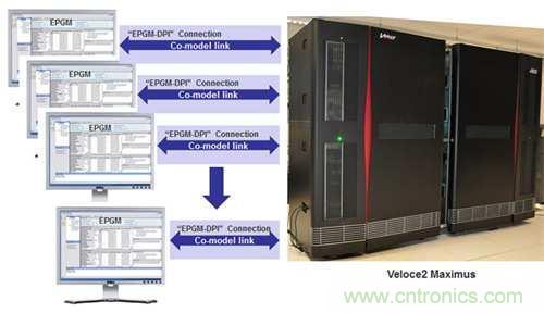 VirtuaLAB可為每個(gè)工作站提供32GMII、XGMII、XLGMII/CGMII和CXGMII埠。多個(gè)工作站的多個(gè)VirtuaLAB應(yīng)用可以結(jié)合在一起,即實(shí)現(xiàn)多個(gè)傳輸通道,可支援多埠數(shù)所需配置。采用高速鏈路(HSL)卡將各個(gè)工作站的協(xié)同模型(Co-model)連接到模擬器中。緊密集成的傳輸機(jī)制已準(zhǔn)備就緒,設(shè)計(jì)時(shí)鐘性能已調(diào)節(jié)至最佳化,并且它對測試平臺來說是透明的。由于采用并行運(yùn)行時(shí)和調(diào)試架構(gòu),資料流(Data-plane)硬體模擬流量會(huì)隨埠數(shù)呈線性增長。圖4為多個(gè)協(xié)同模型拓?fù)涞募軜?gòu)圖。