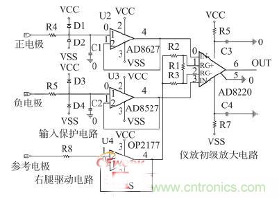 前置放大電路由前級放大電路、帶通濾波電路和50 Hz工頻陷波電路組成,其中,前級放大電路又包括輸入保護(hù)電路、右腿驅(qū)動電路和儀表運(yùn)放放大電路組成,如圖2 所示。