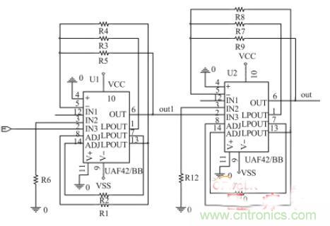 采集電路拾取的心電信號中有低頻的基線漂移和高頻干擾,還有在心電信號頻率范圍內(nèi)的50 Hz 工頻干擾,這些噪聲對心電信號提取的影響非常大。設(shè)計了基于通用有源濾波模塊UAF42 的帶通