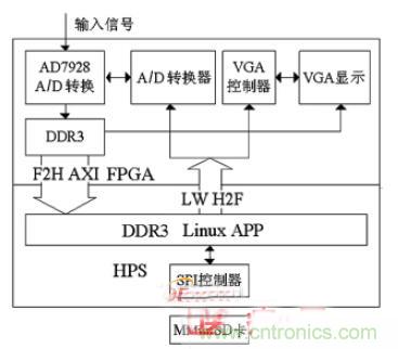數(shù)字系統(tǒng)包括A/D 轉(zhuǎn)換模塊、VGA 顯示模塊、數(shù)據(jù)存儲模塊和算法處理模塊。SoC FPGA 中的HPS 和其它的硬件模塊可以通過Qsys 進(jìn)行配置,用Quartus II 進(jìn)行硬件設(shè)計,Qsys 和Quartus II 編譯可以產(chǎn)生軟件設(shè)計所需的信息文件。移植嵌入式Linux 系統(tǒng),下載sof 文件,用DS—5 進(jìn)行基于Linux 的系統(tǒng)軟件工程開發(fā)。