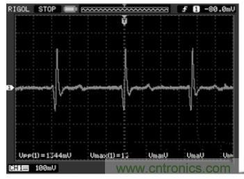 受測者佩戴心電電極,用醫(yī)用導(dǎo)聯(lián)線接入到模擬前端采集電路,后端接入示波器,待信號穩(wěn)定后就可以在示波器上觀測到心電信號波形,圖5 即為模擬前端電路實(shí)際測試波形圖。
