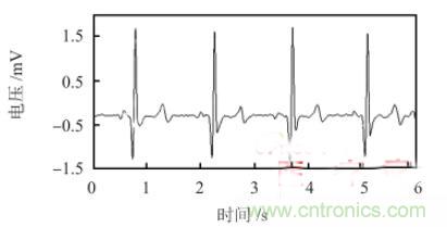接入整體系統(tǒng),運(yùn)行軟件工程,系統(tǒng)存儲一段時間的心電信號,取出Micro SD 卡,讀取存儲的數(shù)據(jù)還原后心電信號波形如圖6 所示。