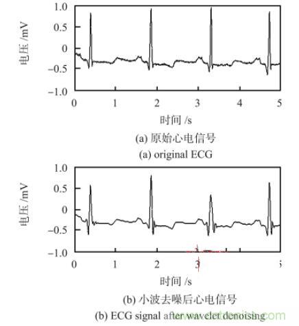 采用小波分析的方法進(jìn)行心電信號去噪。小波分析由于能同時在時域和頻域中對信號進(jìn)行分析,具有多分辨分析的功能,所以,在不同的分解層上有效地區(qū)分信號的突變部分和噪聲。對含有噪聲的原始心電信號進(jìn)行小波分解后,噪聲部分主要集中在高頻小波系數(shù)中,包含有用信號的小波系數(shù)幅值較大,但數(shù)目少;而噪聲對應(yīng)的小波系數(shù)幅值小,數(shù)目較多?;谏鲜鎏攸c(diǎn),選取無偏似然估計閾值對小波系數(shù)進(jìn)行處理,然后對信號重構(gòu)即可達(dá)到消噪的目的。圖7 為心電信號小波去噪前后對比,信噪比可以達(dá)到121 dB。