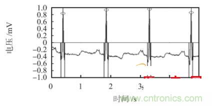 根據(jù)小波變換的理論,信號的奇異點(diǎn)對應(yīng)于其小波變換的一個正模極大值和一個負(fù)模極大值對,其位置對應(yīng)于正、負(fù)模極大值的過零點(diǎn),具體算法是尋找小波變換的模最大值,當(dāng)計算的信號模大于一定閾值時,就判定為QRS 波群。同時,這個閾值也是隨著計算結(jié)果自適應(yīng)更新,在判定為QRS 波群后,再檢測過零點(diǎn)則可判定具體的R 波位置。圖8 即為心電信號QRS 波群檢測和R 波峰定位。