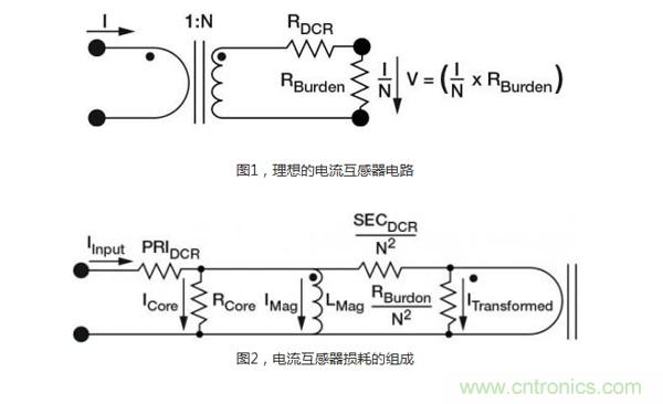 電流互感器(圖1)有三個突出優(yōu)點(diǎn):與線電壓隔離,無損測量電流,大信號電壓能很好地抵御噪聲。這種間接測量電流的方法要求用到變化的電流,例如交流電,瞬變電流或開關(guān)式直流電,來產(chǎn)生一個磁耦合到次級繞組里的變化磁場。次級測量電壓可以根據(jù)在初級和次級繞組間的匝數(shù)比實(shí)現(xiàn)縮放。這種測量方法被認(rèn)為是“無損的”,因?yàn)殡娐冯娏魍ㄟ^銅繞組時的電阻損耗非常小。但是,如圖2所示,由于負(fù)載電阻、芯損,以及初級和次級直流電阻的存在,互感器的損耗會導(dǎo)致失去一小部分能量。