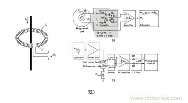 羅氏線圈(圖3)類似于電流互感器,會在次級線圈內(nèi)會感應(yīng)產(chǎn)生一個電壓,電壓大小與流經(jīng)隔離電感器的電流程正比。特殊之處在于,羅氏線圈采用的是氣芯設(shè)計(jì),這一點(diǎn)與依賴層壓鋼等高磁導(dǎo)率鐵芯和次級繞組磁耦合的電流互感器完全不同。氣芯設(shè)計(jì)的電感較小,有更快的信號響應(yīng)和非常線性的信號電壓。由于采用了這種設(shè)計(jì),羅氏線圈經(jīng)常被用在像手持電表這樣的已有接線上,臨時性地測量電流,可以認(rèn)為是電流互感器的低成本替代方案。