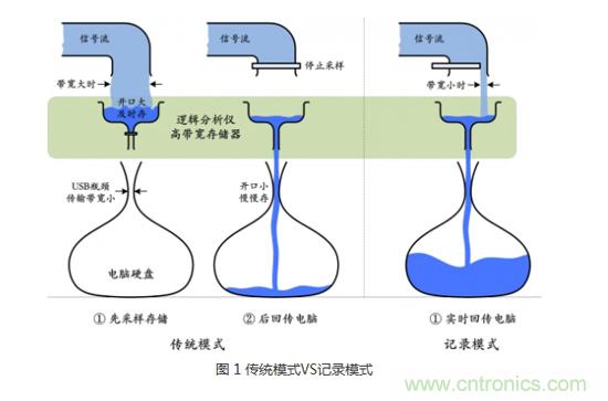 圖 1形象的詮釋了傳統(tǒng)模式和記錄模式的區(qū)別;當(dāng)信號流很大時,直接存到細(xì)口瓶肯定溢出,只能先存到寬口瓶,存滿后先停下來,再慢慢傳回細(xì)口瓶;當(dāng)信號流不大時,寬口瓶充當(dāng)傳輸管,將信號流直接引入細(xì)口瓶,可長時間不間斷存儲。