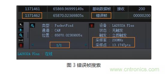 這個大可放心,通過強大的搜索或過濾功能,進行“錯誤幀”定位。不用幾十秒,就完成了100多萬幀數(shù)據(jù)的排查,并發(fā)現(xiàn)定位一個錯誤幀(1371462幀),如圖 3所示。