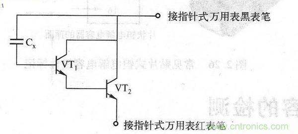 (3)檢測10pF~0.01 ;tF固定電容可采用如下方法。將萬用表調至R×10k擋,選用兩只卩值大于100的 三極管3DC6(或9013)組成復合管,其 電路原理圖如圖2所示。利用復合管的放大作用,把被測電容的充電電流予以放大,以增大萬用表指針的擺動幅度。將被測電容接于復合管的基極b與集電極c間,萬用表的紅、黑表筆分別與復合管的發(fā)射極e和集電極c相接。如果萬用表的指針微擺動后返回至無窮大處,則說明電容正常;如果指針不動或不能返回至無窮大處,則說明電容已損壞。在測試操作時,特別是在測量較小容量電容時,要反復調換被測電容引腳接觸兩點,以明顯地看到萬用表指針的擺動。
