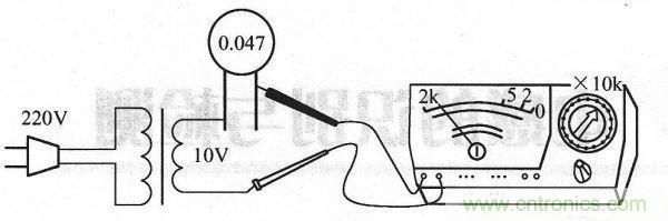 (2)容量小于0.01 pF的固定電容的檢測 檢測10pF以下的小電容時,因電容容量太小,故用萬用表進行測量,只能檢查其是否有漏電、內部短路或擊穿現(xiàn)象:測量時選用萬用表R×10k擋,將兩表筆分別任意接電容的兩個引腳,阻值應為無窮大。如果測出阻值為零,則可以判定該電容漏電損壞或內部擊穿。