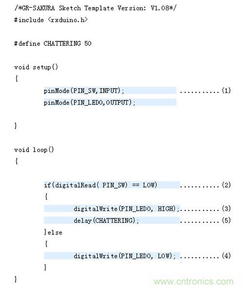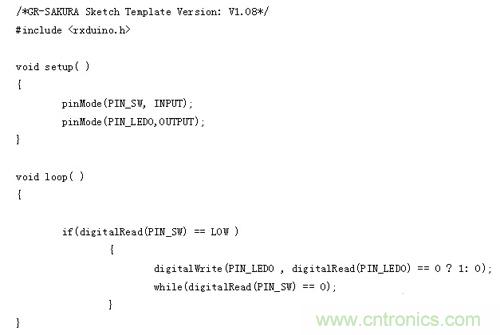 由于這次使用的是GR-SAKURA電路板上的開關(guān)和LED,所以即使不知道與其相連的引腳號和端口號,如為開關(guān),只需在程序中寫入“PIN_SW”,如為LED,只需在程序中寫入“PIN_LED0”?“PIN_LED3”,櫻花程序庫(SAKURA Library)就會(huì)進(jìn)行處理。