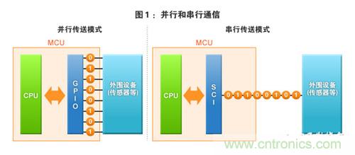 單片機(jī)是嵌入式設(shè)備的“頭腦”,其與作為嵌入式設(shè)備的“手和腳”是各種外圍設(shè)備(輸入輸出設(shè)備等)連接。單片機(jī)應(yīng)該怎樣與這些外圍設(shè)備連接才好呢?比如,我們來考慮一下將傳感器與單片機(jī)連接的情況。如果使用本連載第1期中介紹的“GPIO”的話,從傳感器向單片機(jī)傳送8位信號時(shí)需要使用8個(gè)引腳。這種傳送模式被稱為并行(并行通信)模式(圖1―左)。但是,僅一個(gè)傳感器就需要連接8個(gè)引腳,確實(shí)太可惜了,是否還有連接更少的引腳就能達(dá)到同樣目的的方法呢?