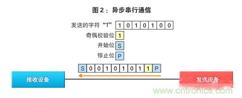 在異步通信模式的串行通信狀態(tài)下,一字節(jié)的文字信息※1在“開始位”(Start bit,意味著開始發(fā)送)和“停止位”(Stop bit,意味著停止發(fā)送)之間發(fā)送(圖2)。由此,無需I2C (Inter-Integrated Circuit,內(nèi)部集成電路)”及“SPI(Serial Peripheral Interface,串行外設(shè)接口)”等時(shí)鐘信號線(但在其他的串行通信模式中這些時(shí)鐘信號線是必需的,以對發(fā)送和接收的時(shí)序進(jìn)行同步)。另外,還可追加用于檢查數(shù)據(jù)是否已正常發(fā)送的“奇偶校驗(yàn)位(Parity bit)※2”。