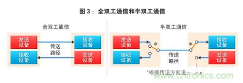 在異步通信中,能實(shí)現(xiàn)按“單片機(jī)→外圍設(shè)備”或“外圍設(shè)備→單片機(jī)”的方向確保數(shù)據(jù)信號專用的信號線時(shí),被稱為全雙工通信。另一方面,將通過1根信號線來切換通信方向的方式稱為半雙工通信。全雙工方式時(shí)需要2根信號線,可同時(shí)進(jìn)行發(fā)送和接收。半雙工方式時(shí)僅需1根信號線,但必須在發(fā)送和接收之間進(jìn)行切換(圖3)。