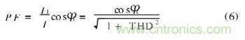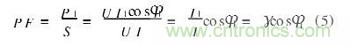 2) 若系統(tǒng)輸入電壓為標(biāo)準(zhǔn)的正弦波,僅有基波分量,即有效值電壓為基波電壓,輸入電流是非正弦信號,即包含基波分量,又含有其它高次諧波。電流基波分量的有效值可視為基波分量的有功分量和無功分量的正交合成φ1為輸入電壓與輸入電流基波之間的相位角。故P = UI1cosφ1,代入式(4)得