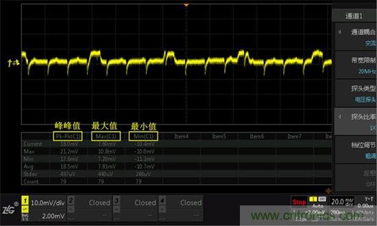 紋波測試一般以峰峰值來表示,具體可以使用【measure】進行自動測量,如下截圖ZDS2000系列示波器,能支持51種真正意義的參數(shù)測量統(tǒng)計功能,基于全存儲深度的基礎(chǔ)上測量紋波的參數(shù),或者也可以使用“一鍵光標(biāo)”進行手動測量,如下圖6所示。