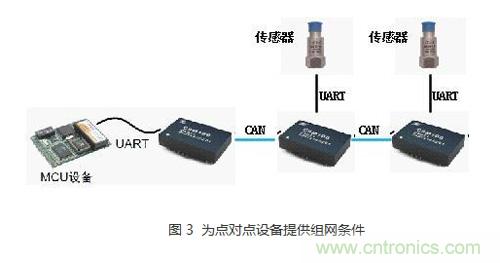我們都知道CAN總線是一種多主總線,可以實(shí)現(xiàn)多節(jié)點(diǎn)組網(wǎng)通訊,自帶優(yōu)先級仲裁機(jī)制,可有效防止數(shù)據(jù)沖突?;谶@一優(yōu)點(diǎn),可以利用CSM100模塊為點(diǎn)對點(diǎn)通訊設(shè)備提供組網(wǎng)的條件。例如,某些串口接口的