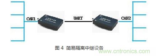 如圖4所示,將兩個CSM100的UART口交叉對接,設(shè)定工作模式為透明帶標(biāo)識符傳輸,分別設(shè)置各自對接CAN網(wǎng)絡(luò)的通訊波特率參數(shù)。這樣CAN總線的報(bào)文數(shù)據(jù)會先轉(zhuǎn)換成串口再轉(zhuǎn)換為CAN數(shù)據(jù),信號得到了放大和隔離。