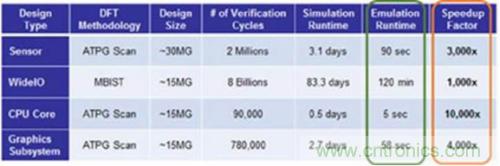 硬件加速仿真的執(zhí)行速度比軟件仿真高出幾個數(shù)量級,而不是小幅增加。在硬件加速仿真中運行 DFT 模式時,某些衡量標準提高了四到五個數(shù)量級。參見表 1。