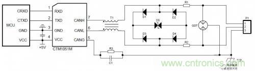 上圖中除了右端的保護電路,中間使用的CAN隔離收發(fā)器模塊,該模塊主要集成了CAN收發(fā)器、DC-DC電源模塊、信號隔離電路三部分電路,打包封裝成一個獨立的模塊,可大大簡化CAN硬件設(shè)定的難度,降低開發(fā)時間成本。