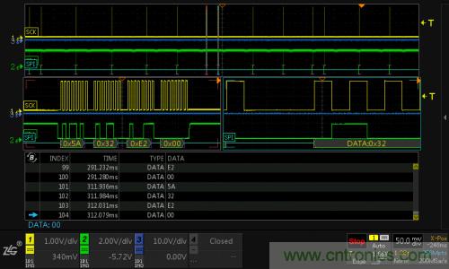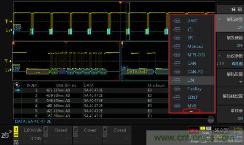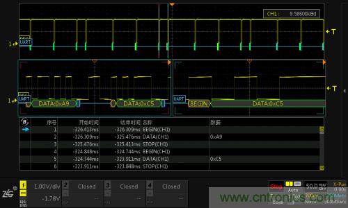 ZDS4000系列示波器免費標配以上30余種協(xié)議解碼,支持解碼以“十進制”,“十六進制”,“字符”三種方式顯示,如圖9、10所示。