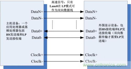 MIPI-DSI利用單端和差分信號線進行數(shù)據(jù)傳輸,LP模式下進行單端數(shù)據(jù)傳輸,HS模式下進行差分數(shù)據(jù)傳輸,使用可以雙向傳輸?shù)腄ata0+/Data0-數(shù)據(jù)Lane進行配置。